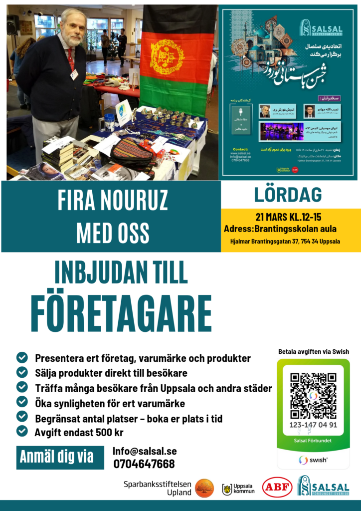 Inbjudan till företagar Nouroz Festival 21 marsSalsal Förbundet Uppsala arrangerar en stor Nouroz-festival den 21 mars kl.12:00 -15:00 i Brantingsskolan aula (Hjalmar Brantingsgatan 37, 754 34 Uppsala).